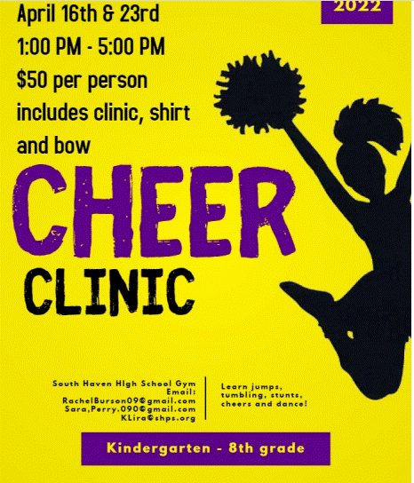 South Haven Athletics and Rocket Football/Cheer will be hosting a competitive cheer clinic this spring for athletes ages K-8th grade. To register contact Coach Rachel Burson at rachelburson09@gmail.com. See the flyer below for more information.