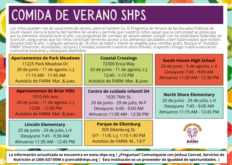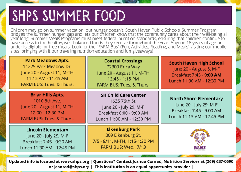 Children may go on summer vacation, but hunger doesn't. South Haven Public Schools' Summer Program bridges the summer hunger gap and lets our children know that the community cares about their well-being all year long. Summer Meals Programs must meet federal nutrition standards, ensuring that children continue to have access to the healthy, well-balanced foods they receive throughout the year. Anyone 18 years of age or under is eligible for free meals. Look for the "FARM Bus" (Fun, Activities, Reading, and Meals) visiting our mobile sites, bringing with it our traveling nutrition education and fun giveaways!